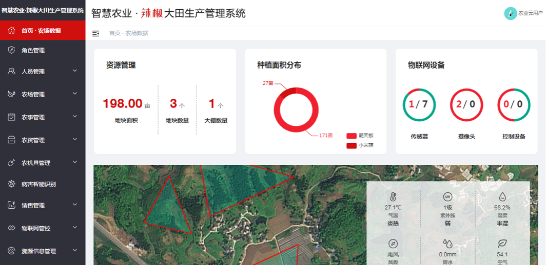 针对不同渠道挖掘的辣椒育种育苗、大田生产种植、销售流通等数据进行分析,根据数据分析结果进行有效的管控, 相关数据可以通过大屏进行直观展示,依托部署在生产现场的各个传感节点和无线通信网络实现农业生产环境的智能感知、 智能预报预警、智能分析、智能决策、专家在线指导,为项目试验示范地辣椒提供育苗生产、栽培种植、经营销售等大数据管理运营服务。